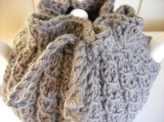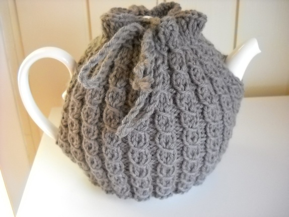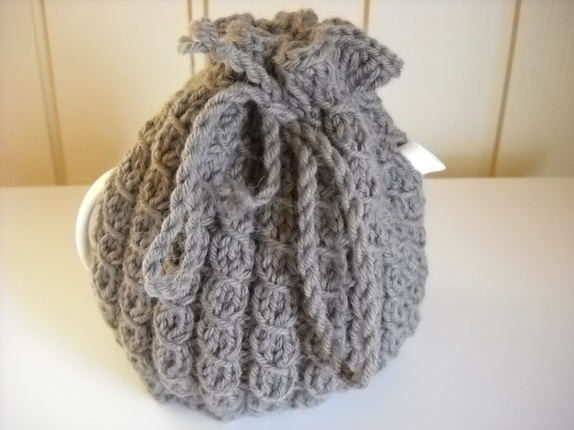 Håndstrikket te-kanne varmer med fletter i 50% ull og 50% alpakka. Passer både liten og medium te-kanne, se bilder (første bilde medium kanne, siste bilde liten kanne). Høyde: 18 cm. Bredde: 20cm (elastisk). Vaskes for hånd eller på ull-program.