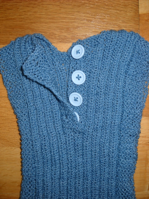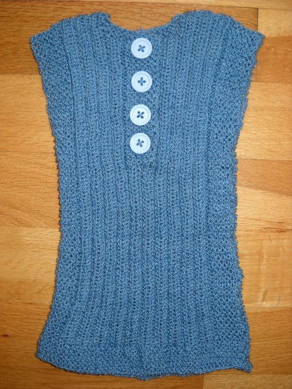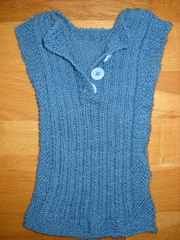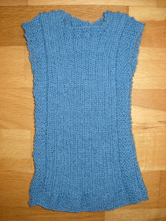 Håndstrikket ull/silke undertrøye eller vest, i blått. Str: ca 2år, meget elastisk. Lengde: 32cm. Bredde: 20cm (30cm strukket ut) Vaskes for hånd eller på 30 grader ullprogram.