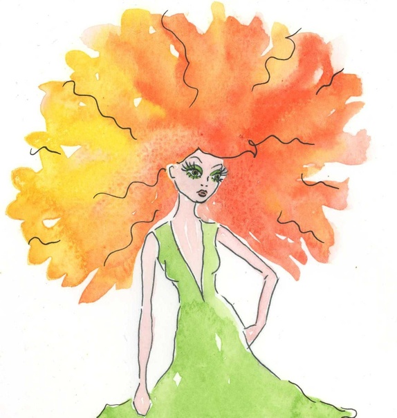 Moteillustrasjon, modell grønn kjole, med flammende rød-oransje hår.