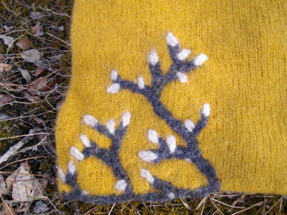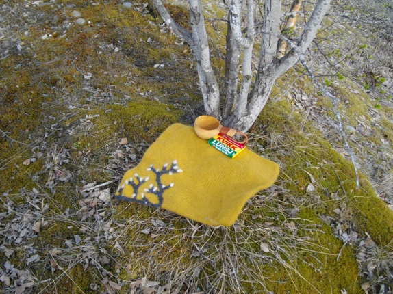 Sitteunderlag som er strikket i 2-tråds raumagarn, dekorert og tovet i maskin. Lunt og godt under stumpen sommer som vinter.