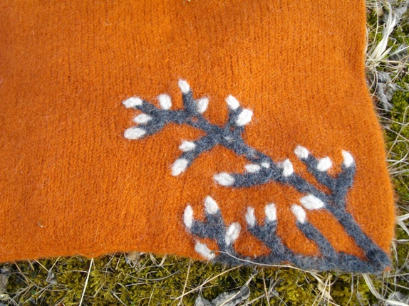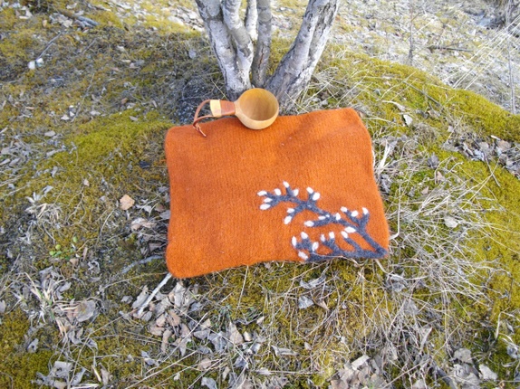 Sitteunderlag som er strikket i 2-tråds raumagarn, dekorert og tovet i maskin. Lunt og godt under stumpen sommer som vinter.