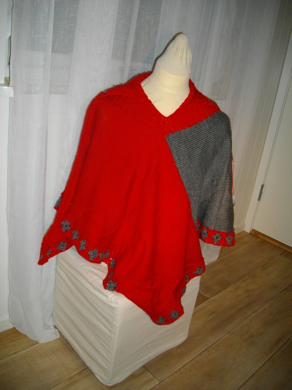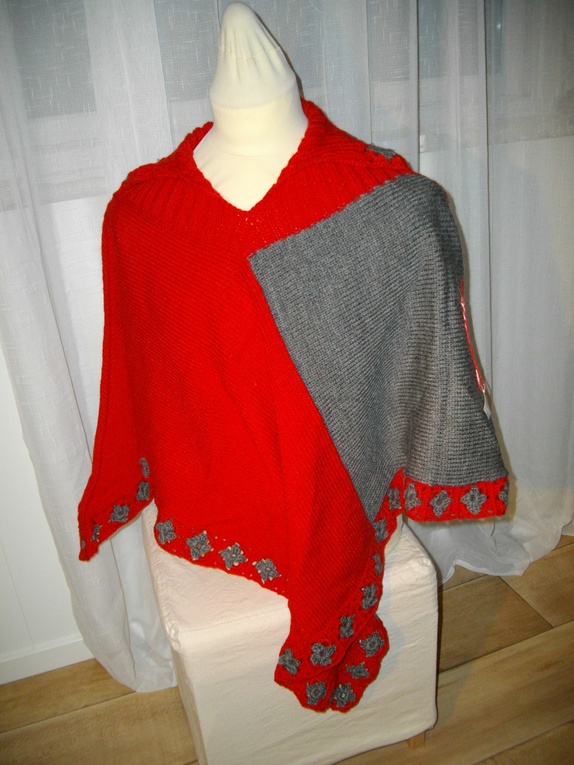 Dette er en poncho strikket i fire felt - noe som gir en svært god passform og litt følelse av arm! Den er nydelig på kjølige sommerkvelder med sitt myke garn med 40 % ull. Den flotte rødfarven kombinert med varm grå gjør den anvendelig hele året! Oldemorsruter i begge farvene er påsydd rundt hele ponchoens nedkant. Og kraven er dekorert på samme måte.