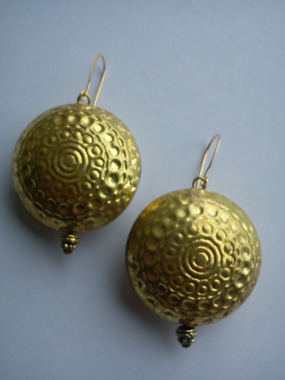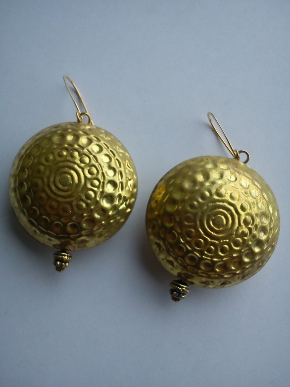 SALG: før 250,-Store ørepynt i nye marterialer. Gullfarget metall med litt slitt preg. Forgylte øreheng.hele ørepynten med heng ca 6.3 cm. bredde 3.2 cm. Frakt inkl. i pris