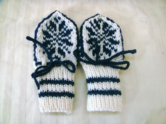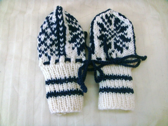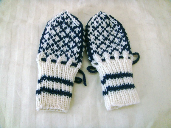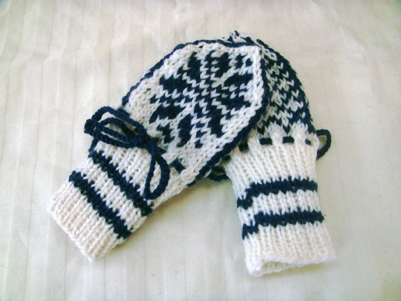 Vottene er strikket i Gjestal baby ull.100% merino ull. Fargene er marine og hvit. De er uten tommel. Størrelse : 0- 3 mnd.Hel lengde 14 cm.Hel bredde/ omkrets 14 cm. Vask : 40 grader ullprogram i maskinen,uten skyllemiddel.