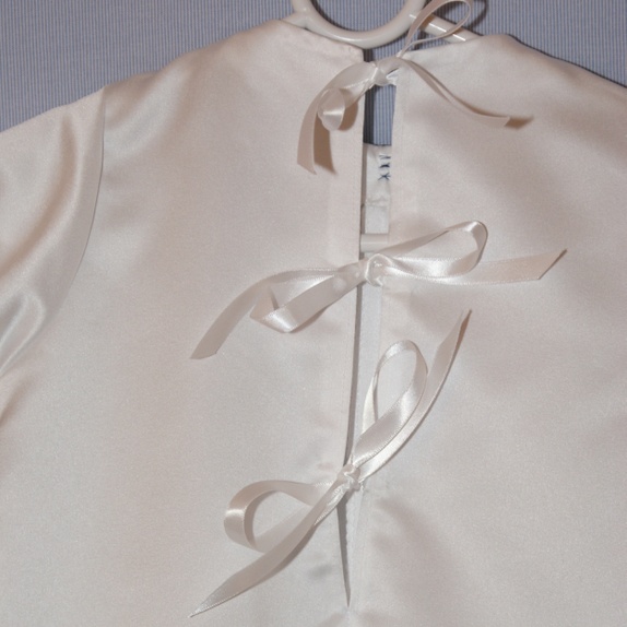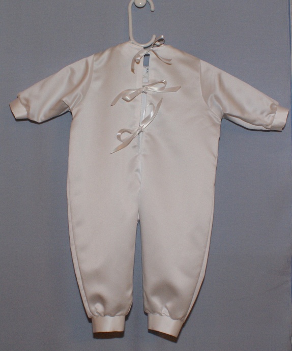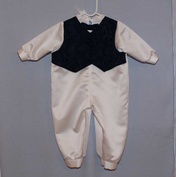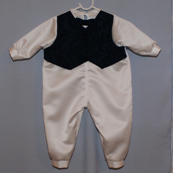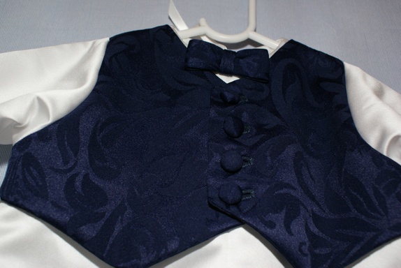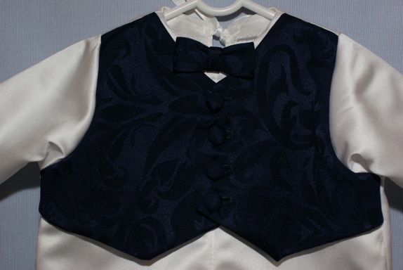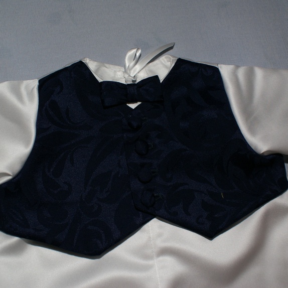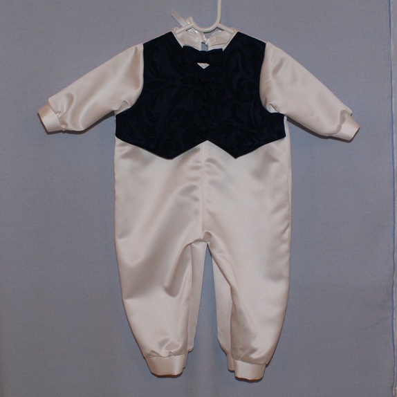 Hel dress sydd i hvit brudesateng med påsydd "vest" i et blått jacquardstoff. Vesten sitter på forstykket. Bak er dressen helt hvit med satengbånd til lukning. Dressen har påsydd sløyfe i halsen og håndsydde knapphull. Knappene er trukket med samme stoff som vesten. Til en gutt er dette et fint alternativ til dåpskjolen!