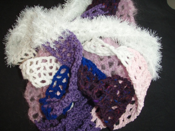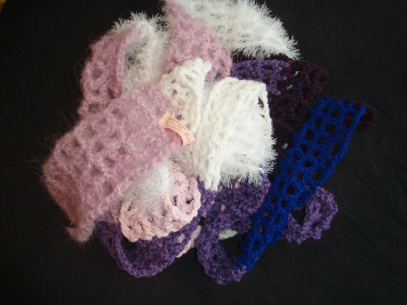 det er brukt flere garnkvaliteter i ull, mohair og forskjellige typer effektgarn (kunstfiber).