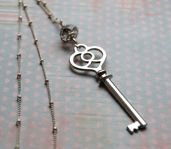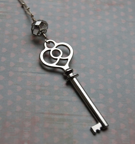 Langt kjede med nøkkelanheng og krystallperle.Lenken er ca 72 cm lang. Anhenget måler 7.5 cm