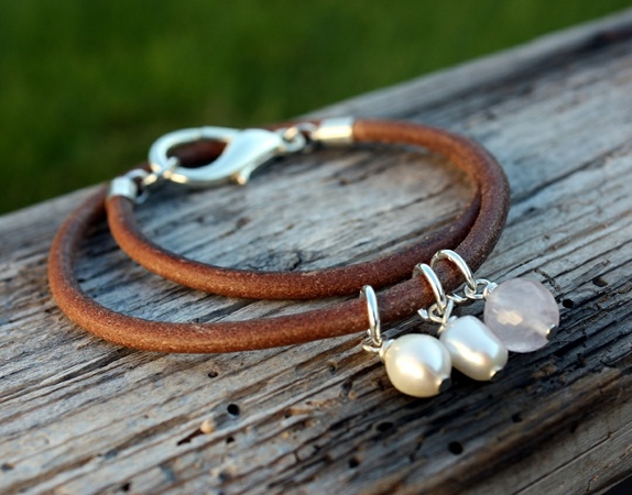 Brunt skinn armbånd med 2 ferskvannsperler og en glass perle. Lås av metall.