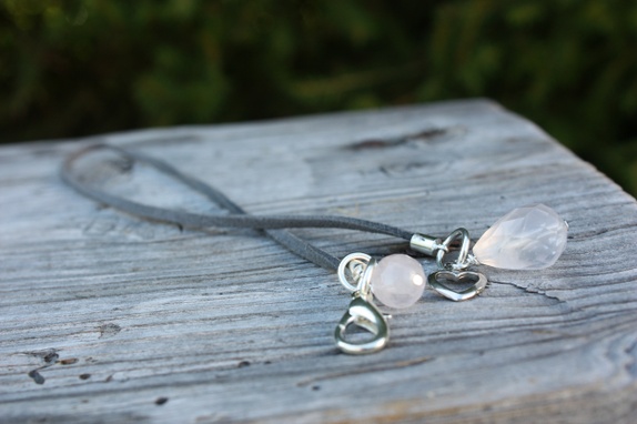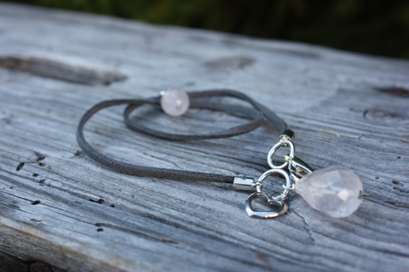 Skinnarmbånd, dobbelt med en rund lys rosa/fersken sten som anheng. i Låsen henger det en dråpeformet sten sammen med et hjerte.
