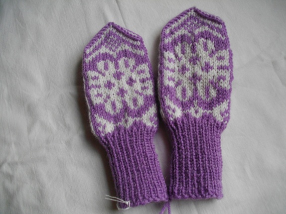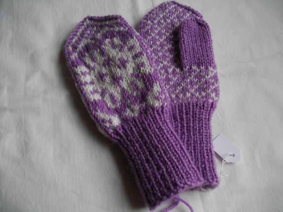Lilla/hvite votter str 5-6 år strikket i ren ull. Vaskes som ull på 30 gr uten skyllemiddel.
