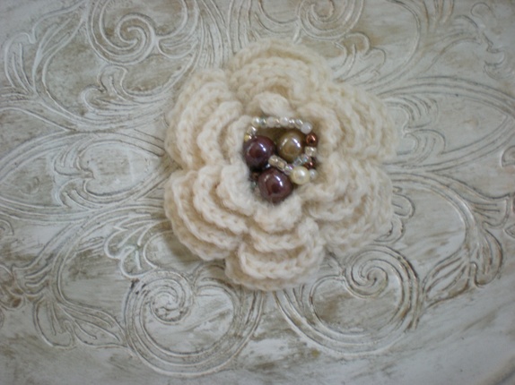 Heklet i ullgarn med pålimet perler i midten og påsydd brosjenål bak.