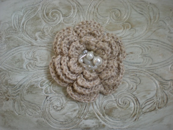 Heklet i merisert bomull/polyestergarn (blank effekt) med pålimet perler i midten og påsydd brosjenål bak.