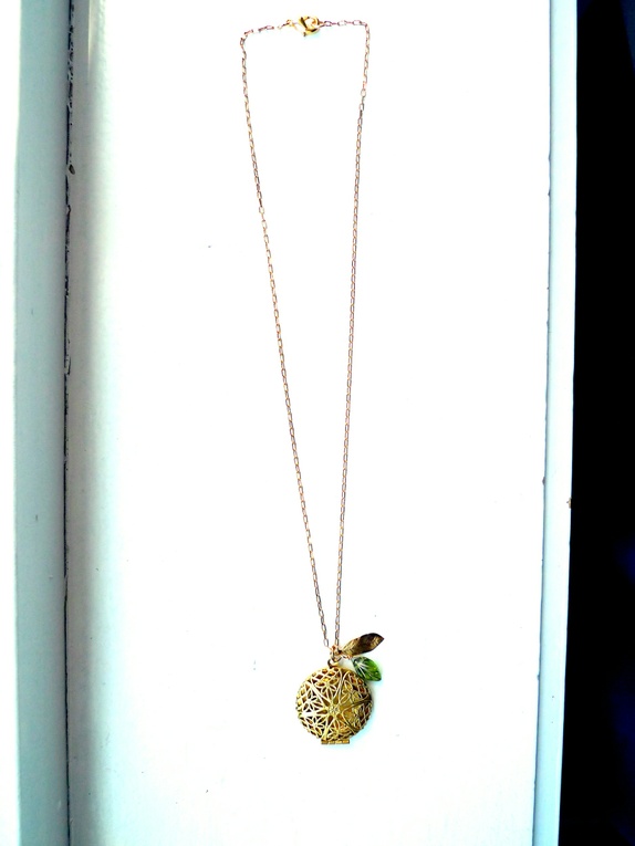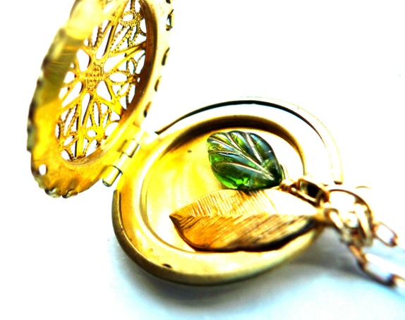 Medaljongen er laget i gyllen messing, og har et filigranspanel som lett kan åpnes og lukkes. Anhenget består i tillegg av et stort gullbelagt blad, og et lite grønt blad i tsjekkisk glass. Sistnevnte er påmalt mønster med gullmaling.