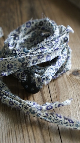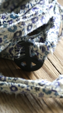 Peace tegn av sten som måler 2,5cm i diameter. Med revet Liberty stoff som ligger dobbelt og måler da ca 68cm hver.