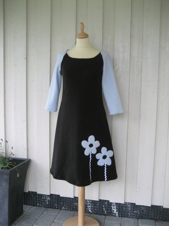 Flott og delikat kjole sydd i sort og isblå polarfleece. Kjolen er pyntet med 2 applikerte blomster og kroklissebånd.