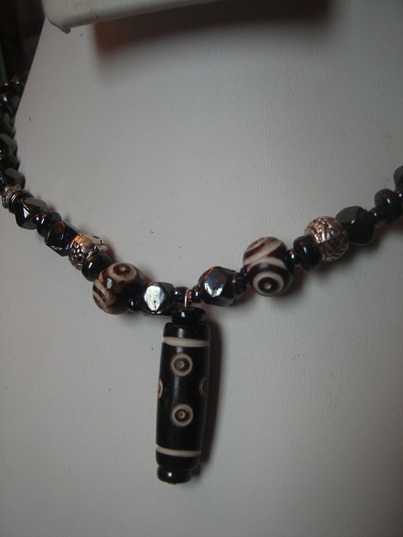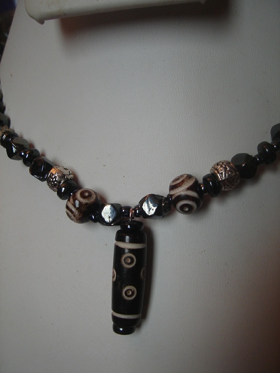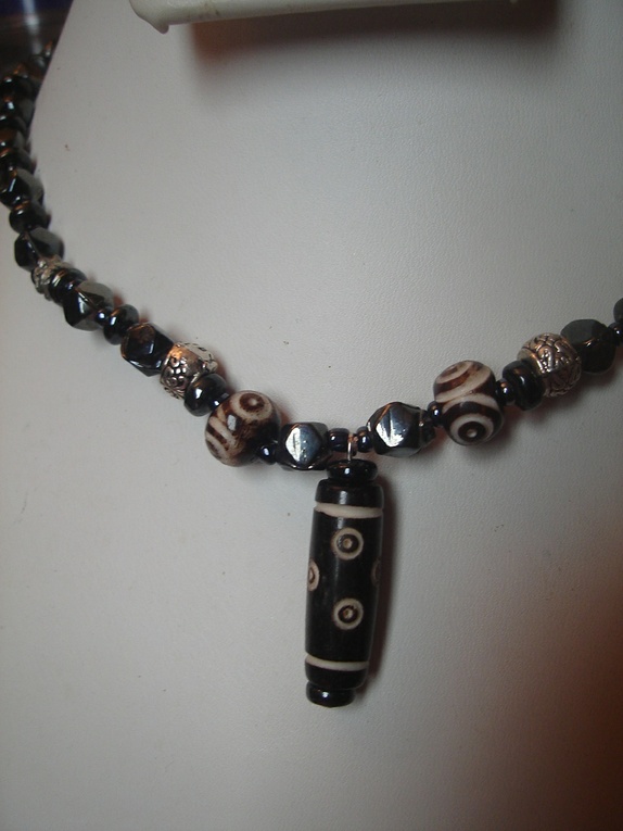 Gutte / Herresmykke m håndskjært bein og masse hematitter.