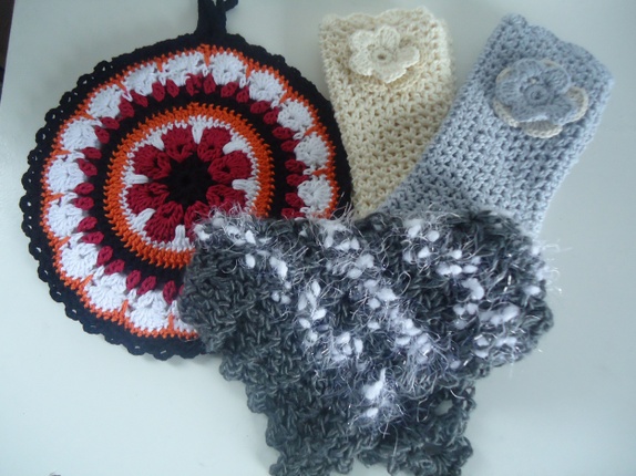 Grytekluter heklet i gjestal sport.2 par pulsvarmere,blå og hvit i eco cotton.Grå hals i gjestal bris med funny effektgarn.