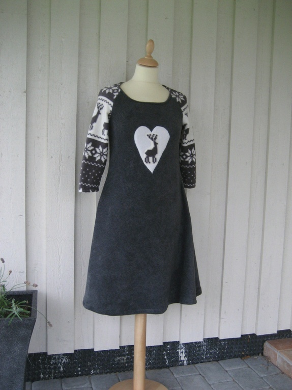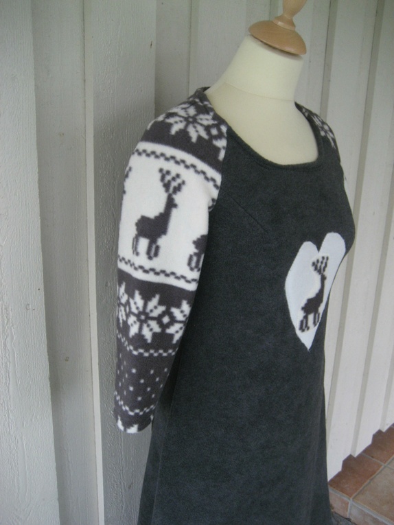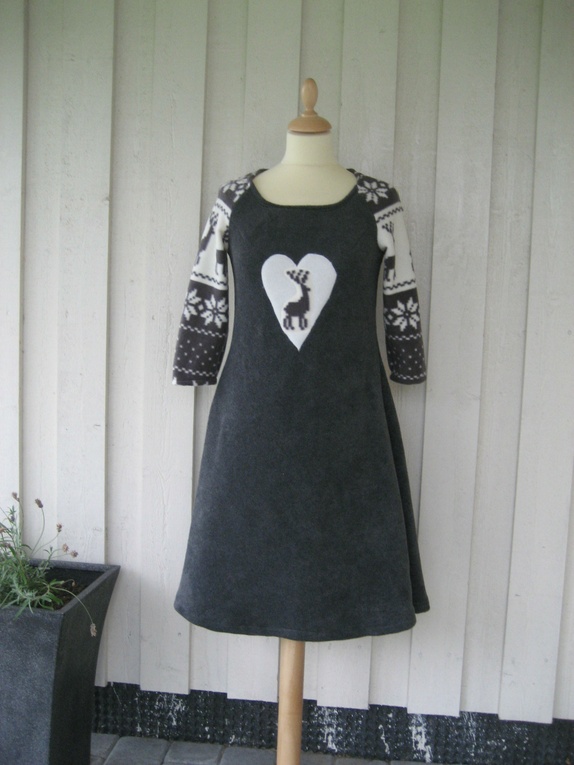 Herlig og lun kjole med tradisjonsrikt mønster, sydd i koksgrå polarfleece og polarfleece med trykk. Kjolen er pyntet med et hjerte applikert med et reisdyr.