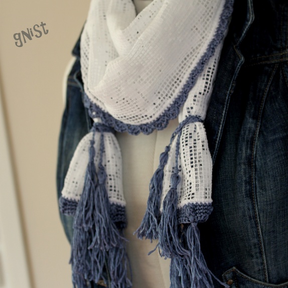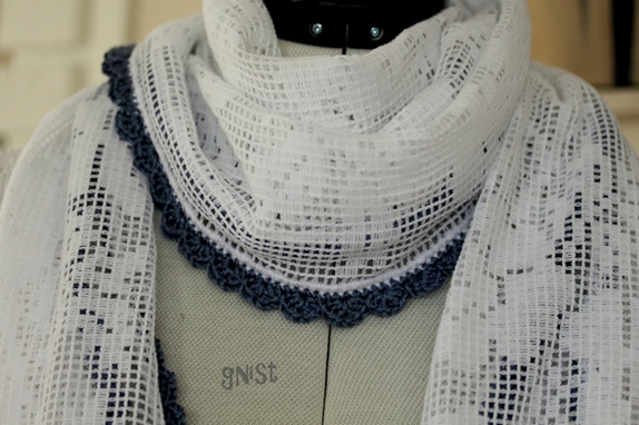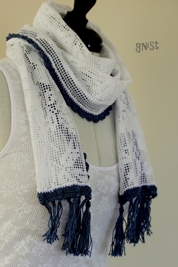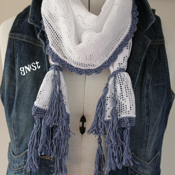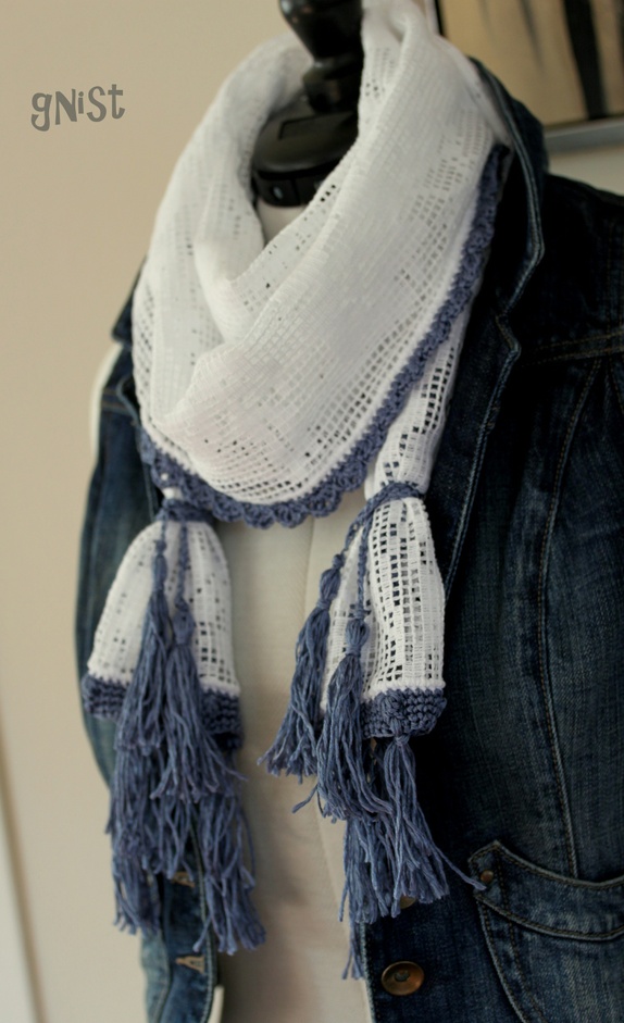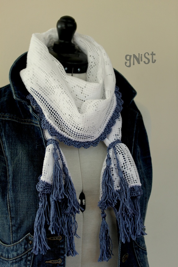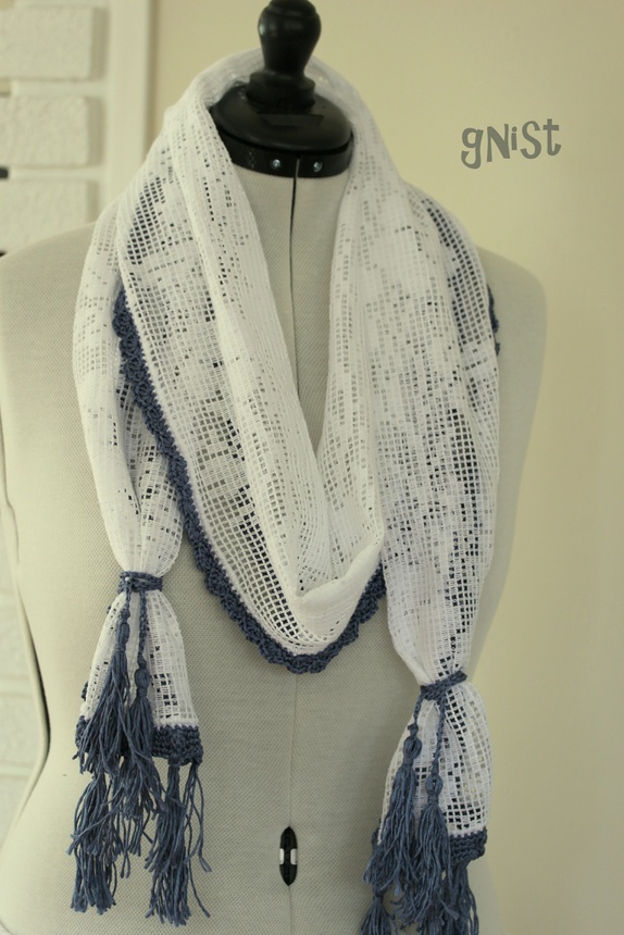 Hvitt langt skjerf av grovt blondestoff med jeansblå heklet kant. Men frynser og dusker.