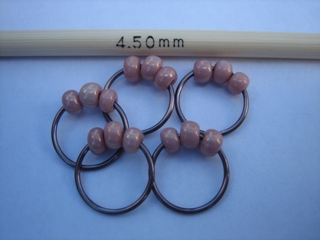 Det første bildet viser de markørene du vil motta. Det andre bildet viser de sammen med en 4.5mm strikkepinne, men de kan fint brukes på større pinner enn dette også. Det tredje viser en tilsvarende markør i et strikketøy på en 3.5mm pinne