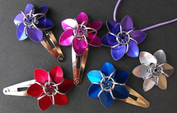 Lilla blomst i anodisert aluminium, montert på hårklemme av stål.
