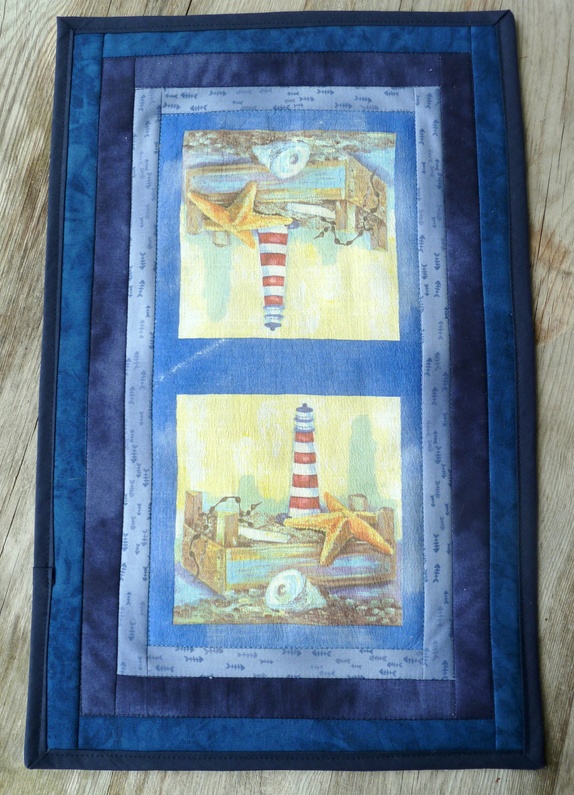 Midtmotivet er decoupage på lin, med kantar i bomull sydd i lappeteknikk rundt.Løparen er vattert og quilta i saumane.Lengd 45 cm.Breidd 29 cm.