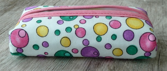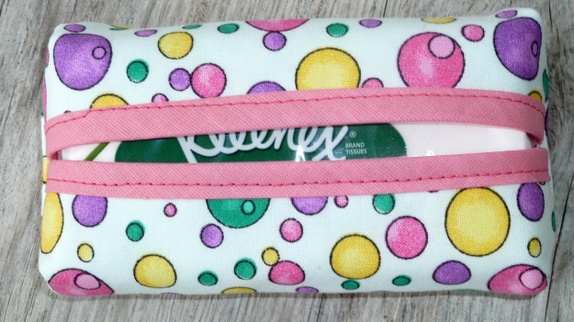 Formsydd kleenex-etui.Ytterstoff og for er i bomull.Etuiet er vattert og fora.