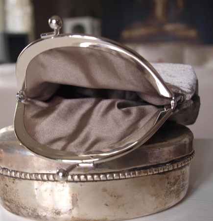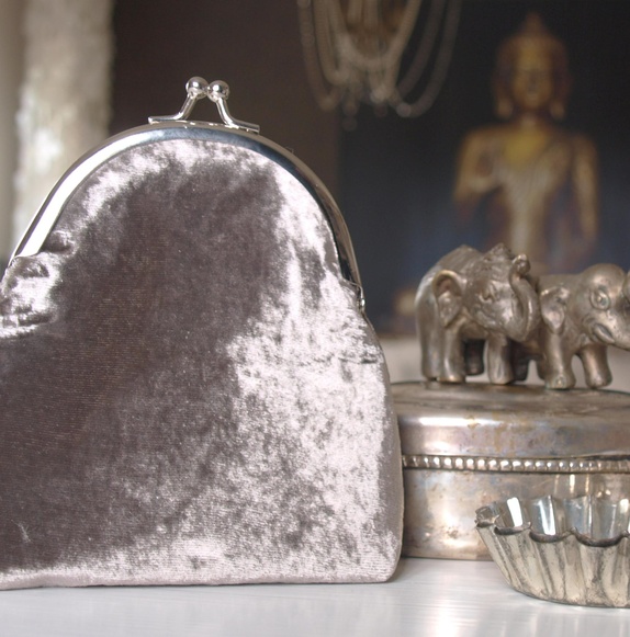 Portemone sydd vintage velur stoffForet med vintage forsilke(syntetisk).Veskelås av messing, måler 10 cm.Vliselin mellom lagene.Portemone målerpå det bredeste: 12 cmhøyde : 14 cm