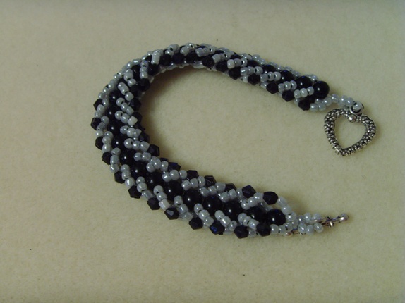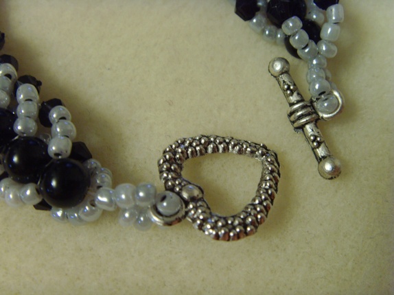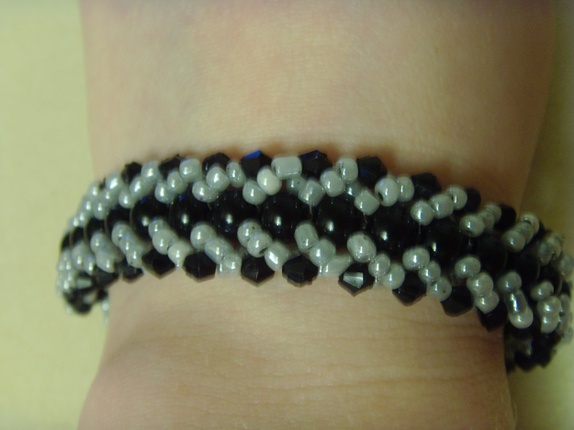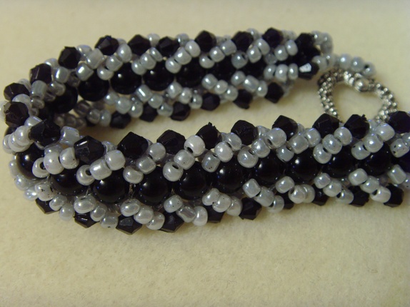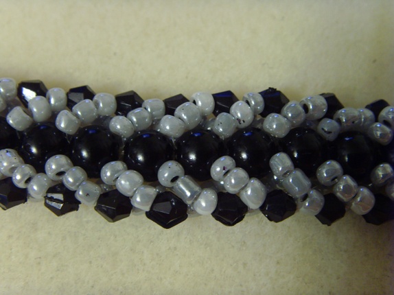 Seed-beadsene er i en grå tone, mens midtraden av runde perler er helt svarte.