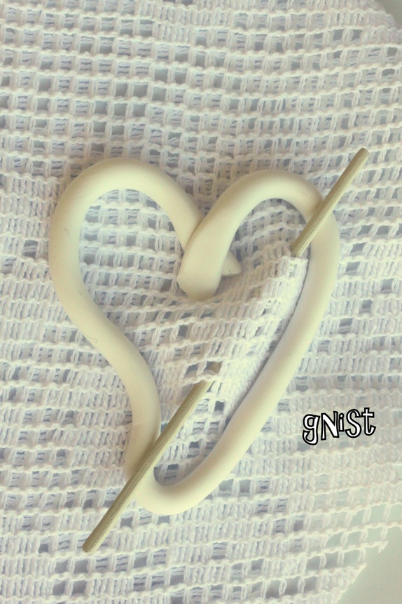 Sjalsnål laget i fimo med hvit pinne av tre.