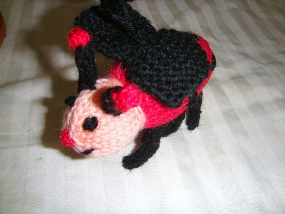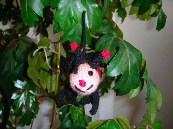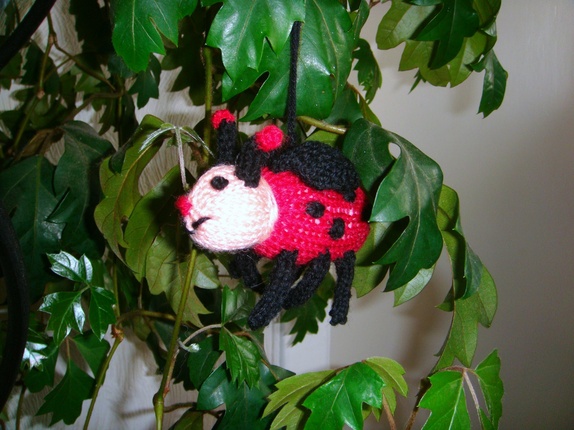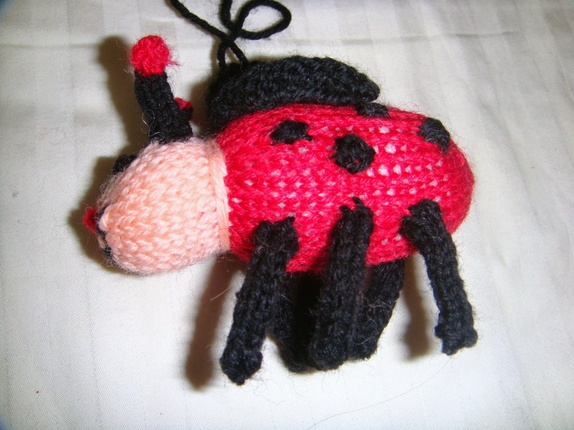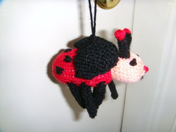 Den lille sjarmerende marihønen med muntert smilefjes passer flott over barnevognen eller en barneseng. Den er strikket i baby ull og høyden uten oppheng er 8 cm,lengden er 9 cm.