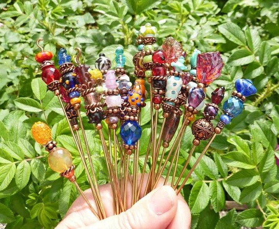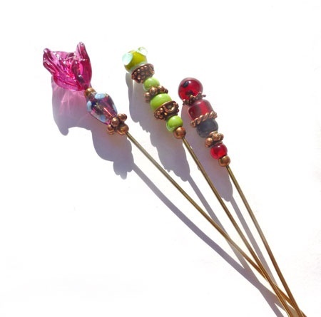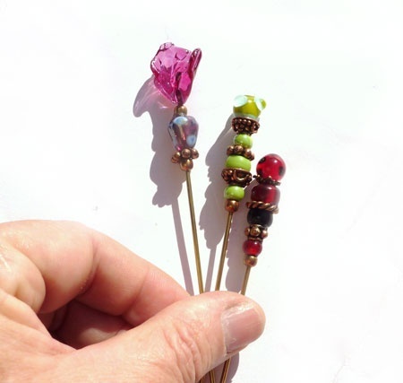 Det er håndlaget lampworkglass, kobber elelr bronse og på stiv messing pinne med stopper. Leveres i organzapose. (enkeltnåler ligger til salgs for 110,- pr stk)