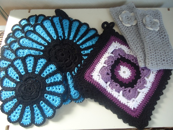 Store grytekluter.4-packglassbrikker.lilla grytkluter og et par blå pulsvarmere.