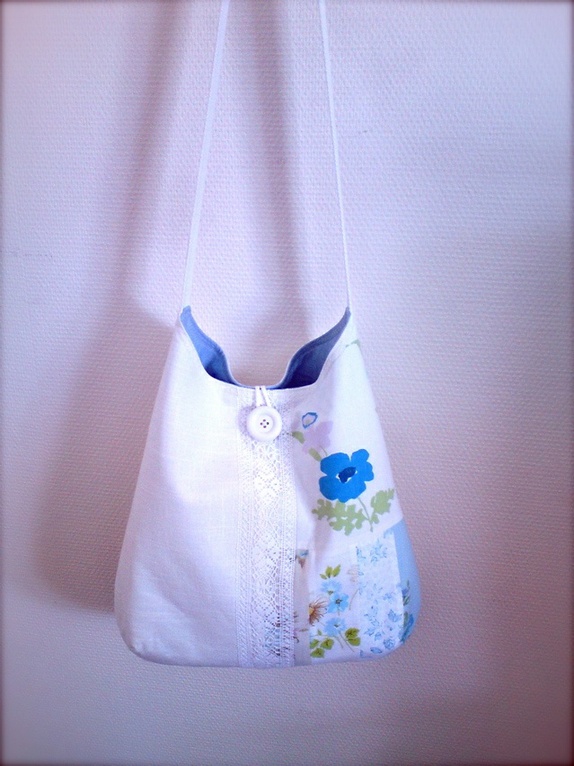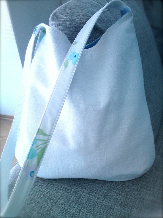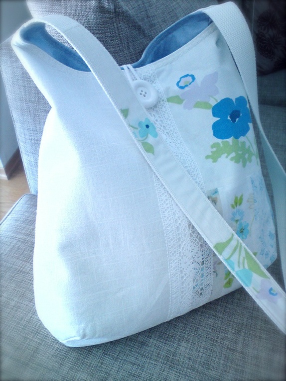 Stor skulderveske i hvit lin og vintage stoffer (har vært sengetøy og gardiner).