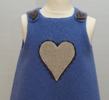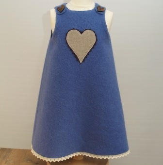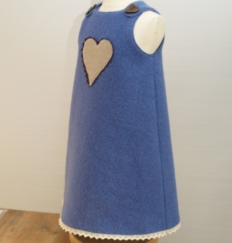 God og varm vinterkjole sydd av et ensfarget, blått ullpledd. Kjolen er perfekt til å holde små, kjoleglade frøkner varme på kalde vinterdager, utenpå en genser og en strømpebukse eller bukse.