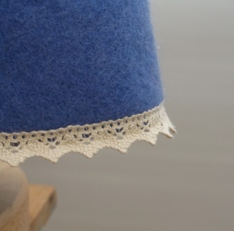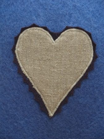 Kjolen er pyntet med en naturhvit, vevd bomullsblonde langs nedre kant. På brystet er det applikert et hjerte, klippet fra en grovvevd bukse i 100% lin. Hjertet er rammet inn av mørk lilla bomullsblonde.