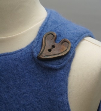 I selene er det store, brune, hjerteformete knapper. De kraftige knappene passer godt til det tykke ullmaterialet i kjolen. Knappene er håndlaget i Nepal, fremstilt for hånd eller med enkle verktøy. Bedriften som lager knappene har en sosial profil, slik at vi vet at arbeiderne blir godt ivaretatt.