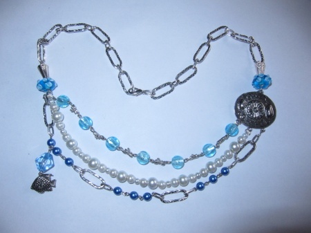 Smykke med flere rader perler og anheng i blåtoner