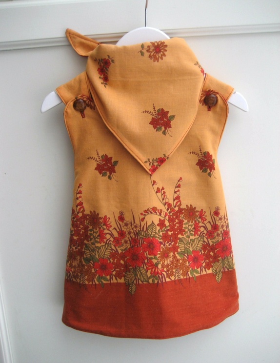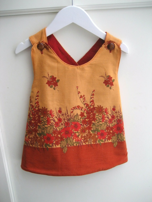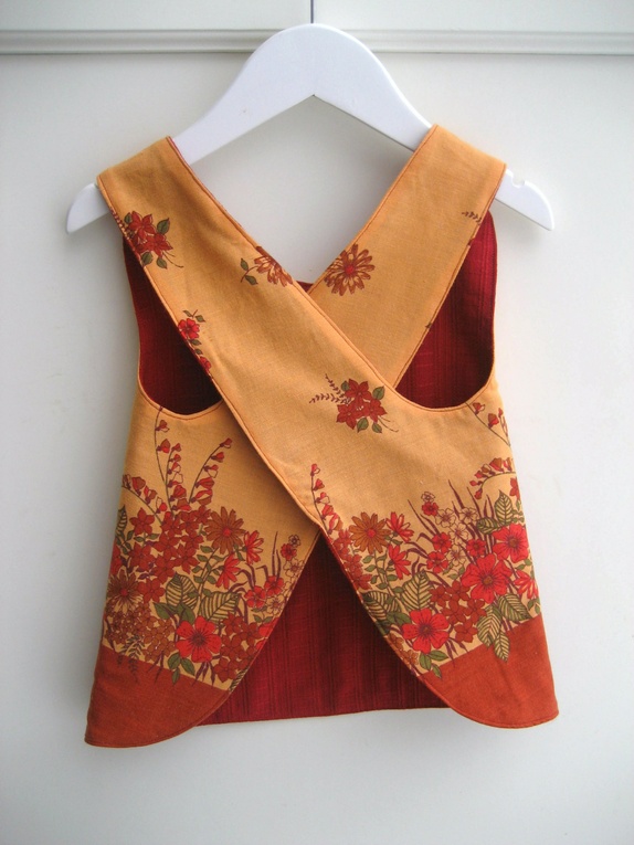 Skjønn forklekjole sydd i vintage bomull med blomster, fòret med rødt. Knapper fra mormors knappesamling.