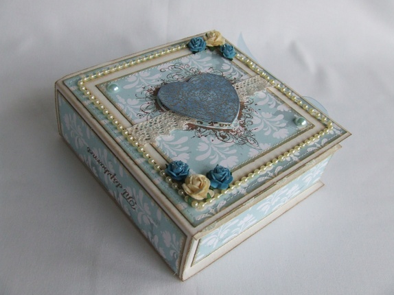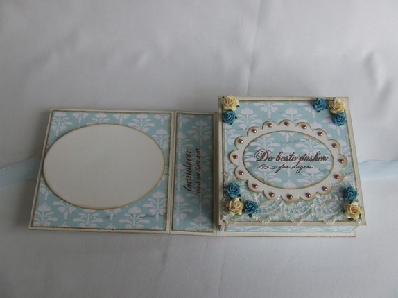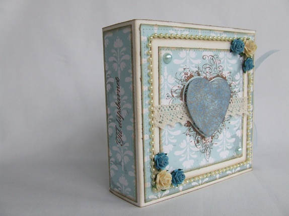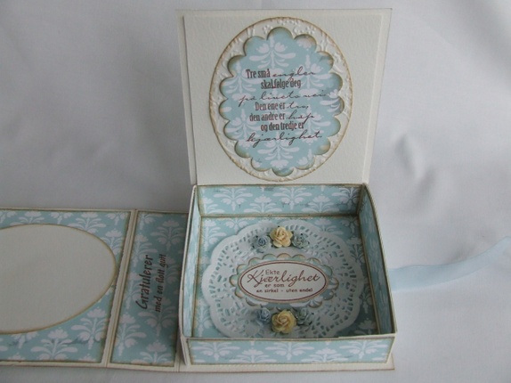Pyntet med mønsterpapir, perlebånd, halvperler, roser, blonde,glitterlim maskinsøm, kakeserviett og stempel.