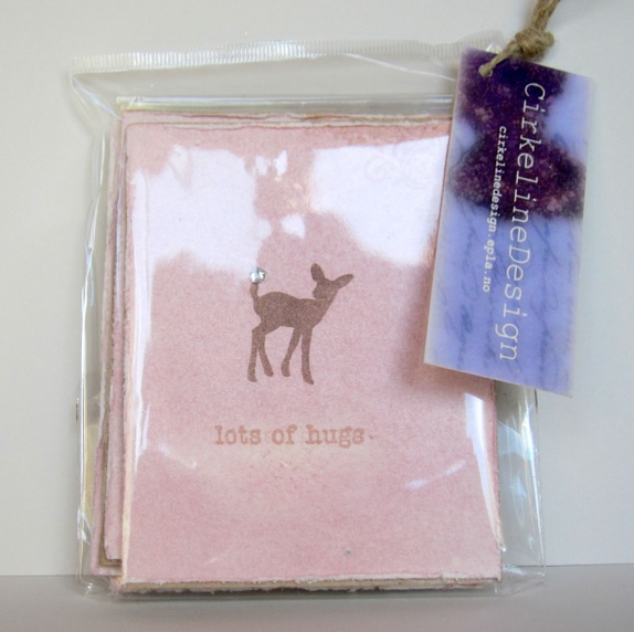 Kortene er pyntet med håndfarget lys lilla akvarellpapir, håndstemplet dådyr med "edelsten" på haletippen, teksten "lots of hugs" og håndstemplede detaljer i hjørnet.