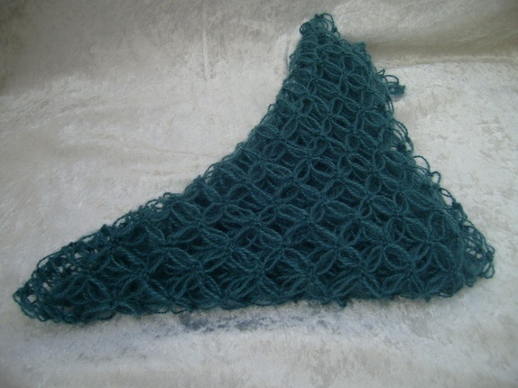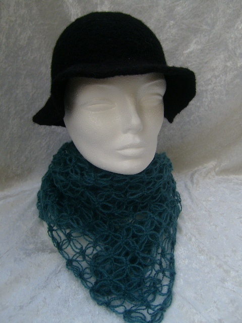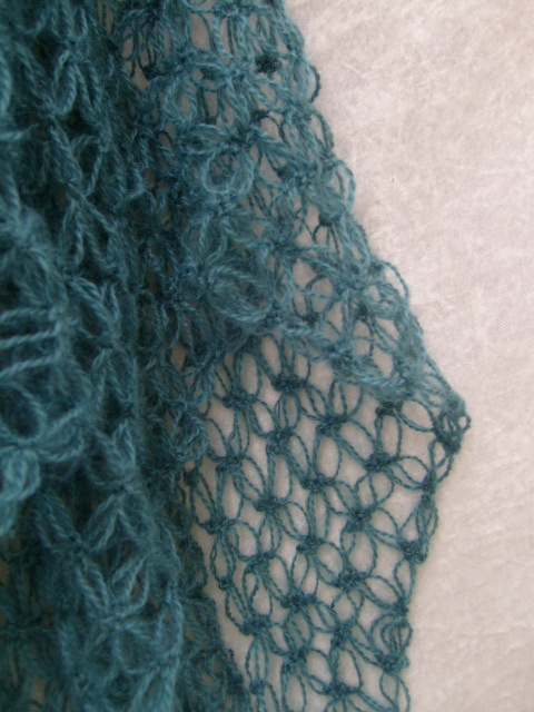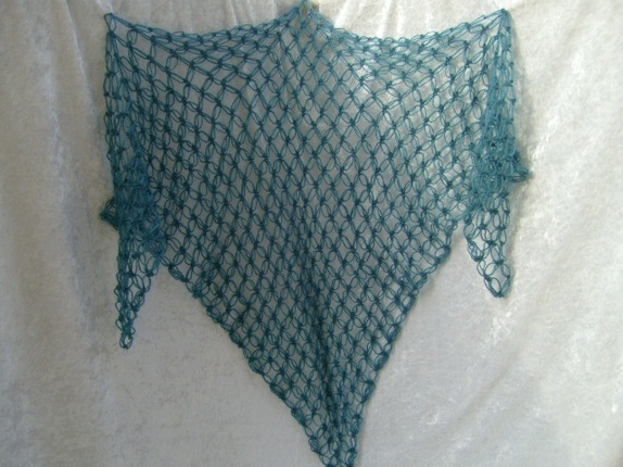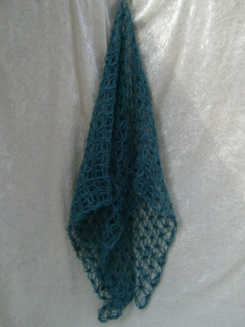 Et herlig og mykt englemaskesjal heklet i nydelig mohair i fargen petrol. Et kjempedeilig sjal å kaste over skuldrene eller ha rundt halsen som skjerf. Godt og varmt,samt et sprekt tilbehør til antrekket ditt.