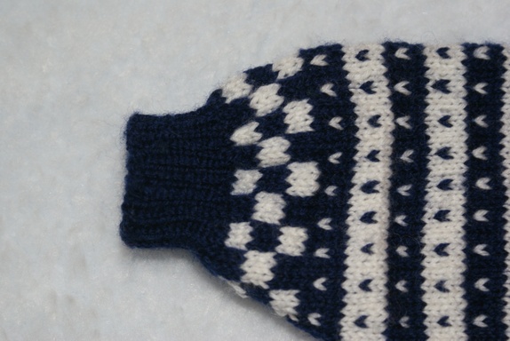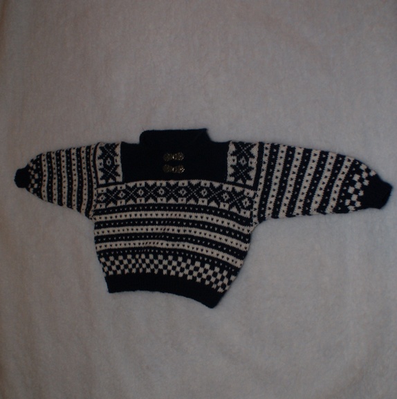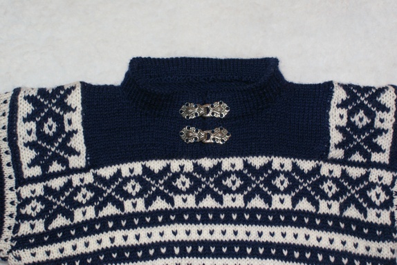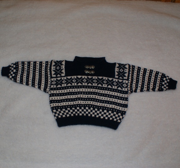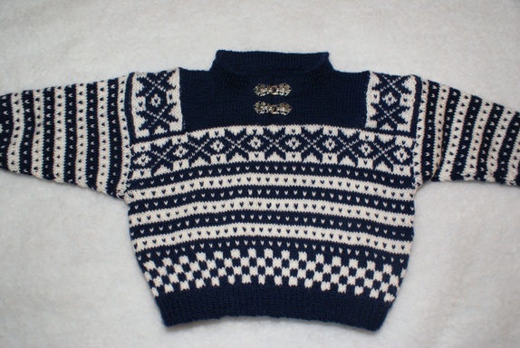 Håndstrikket genser i marineblått og hvitt i Fanamønster med tinnhekter i halsen. Strikket i babygarn i 100% ull. Kan vaskes på ullprogram i maskin.
