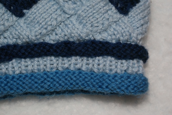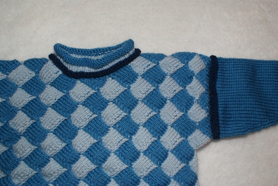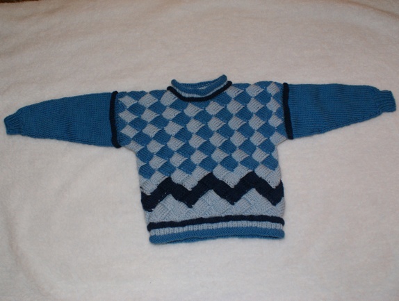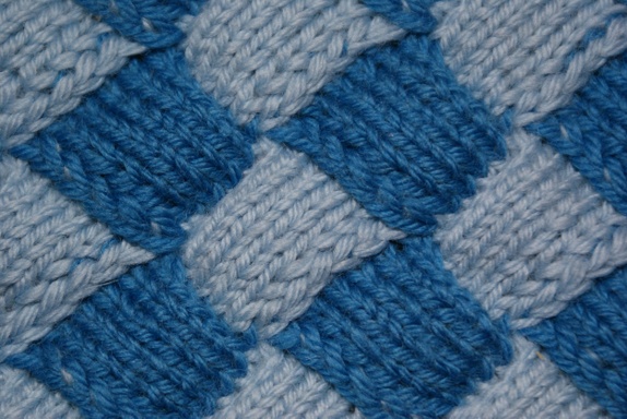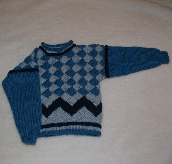 Kontstrikking er en gammel strikketeknikk der man strikker ruter inntil hverandre slik at det ser ut som mønsteret er flettet. Genseren er strikket i tre blåfarger. Den er strikket i et ganske tykt, mykt garn i 100% ull som kan maskinvaskes på ullprogram. En myk og behagelig genser som er god og varm å ha på.