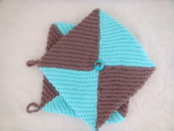 Gryteklutene er strikket i Turkis og Brunt dobbelt Flox garn(100% bomull) Siden de er strikket i dobbelt garn og brettet så blir de ekstra tykke ,de er også veldig myke og gode.De kan vaskes på 60 grader.Målene er 20*20 cm.Gryteklutene har en pynte knapp på ene siden i turkis og brunt.