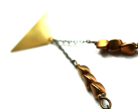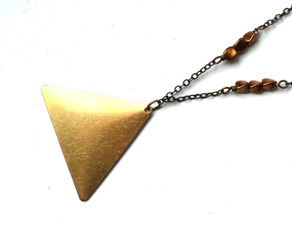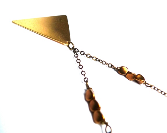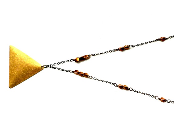 Geometrisk triangelsmykke med små vintageperler festet langs kjedet.