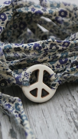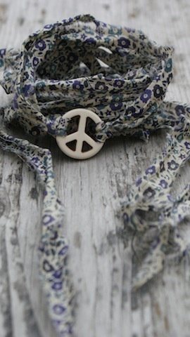 Peace tegn av sten som måler 2,5cm i diameter. Med revet Liberty stoff som ligger dobbelt og måler da ca 68cm hver.