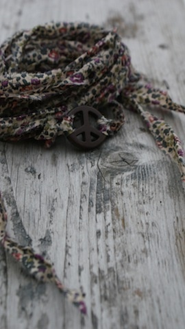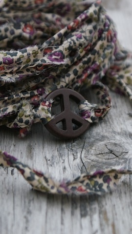 Peace tegn av sten som måler 2,5cm i diameter. Med revet Liberty stoff som ligger dobbelt og måler da ca 68cm hver.