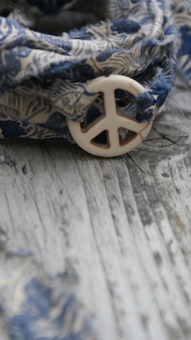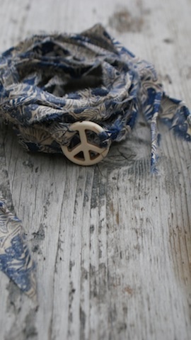 Peace tegn av sten som måler 2,5cm i diameter. Med revet Liberty stoff som ligger dobbelt og måler da ca 68cm hver.