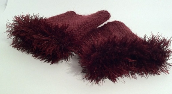 Pulsvantene er håndlaget i burgunder ullgarn med pyntekant av effektgarn i samme farge, men en nyanse mørkere.